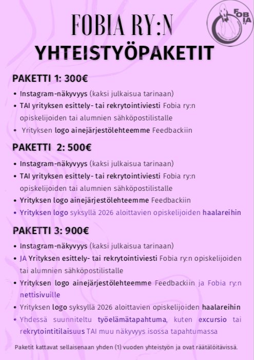 Fobia ry pyrkii edistämään suhteita yrityksiin ja luomaan kumpaakin osapuolta hyödyttäviä yhteistyön muotoja. Yritysyhteistyön muotoja voi olla esimerkiksi näkyvyyden tarjoaminen sosiaalisessa mediassa, ekskursiot, koulutukset ja rekrytointitapahtumat. Vuoden 2026 hallituksessa yritysyhteistyövastaavana toimii Anssi ( aerinn [at] utu [piste] fi), joka ideoi ja toteuttaa Fobian ja yritysten välistä yhteistyötä.